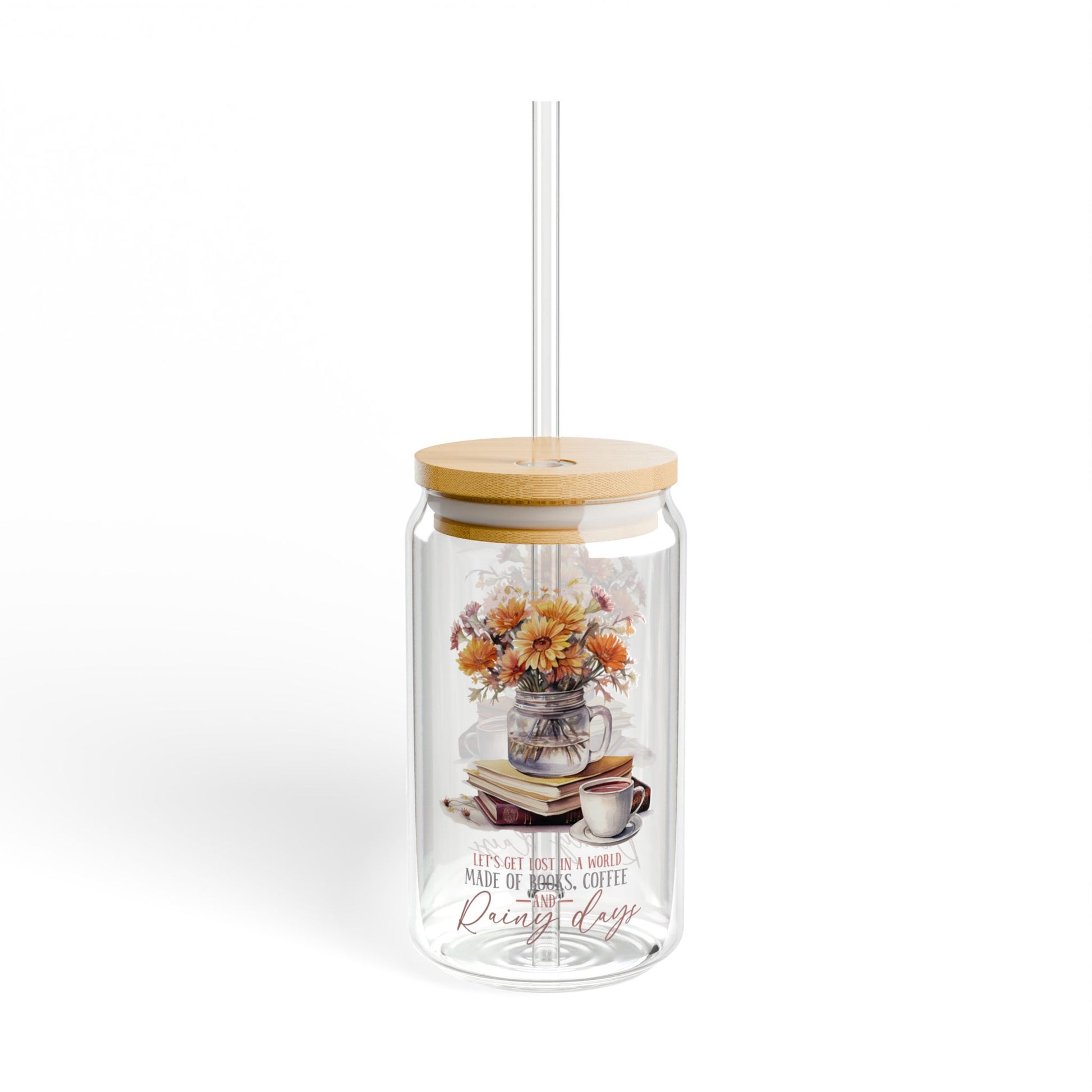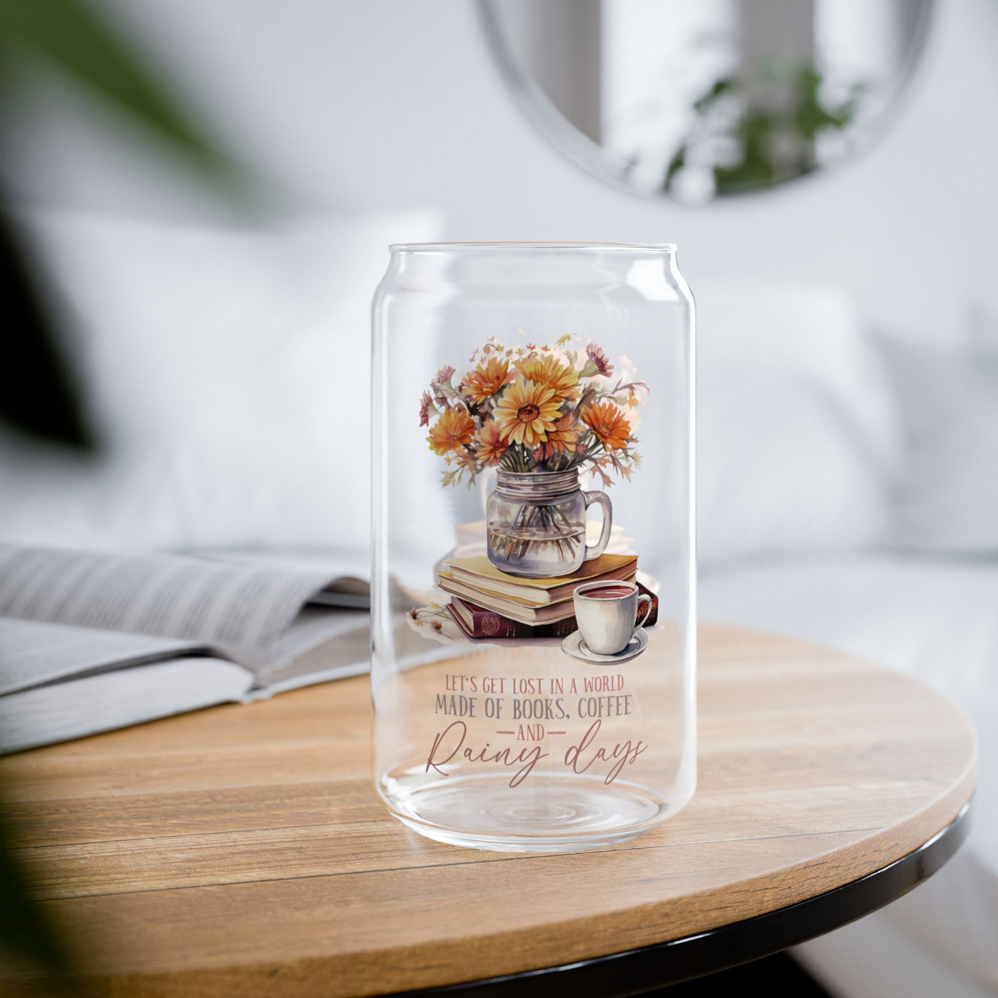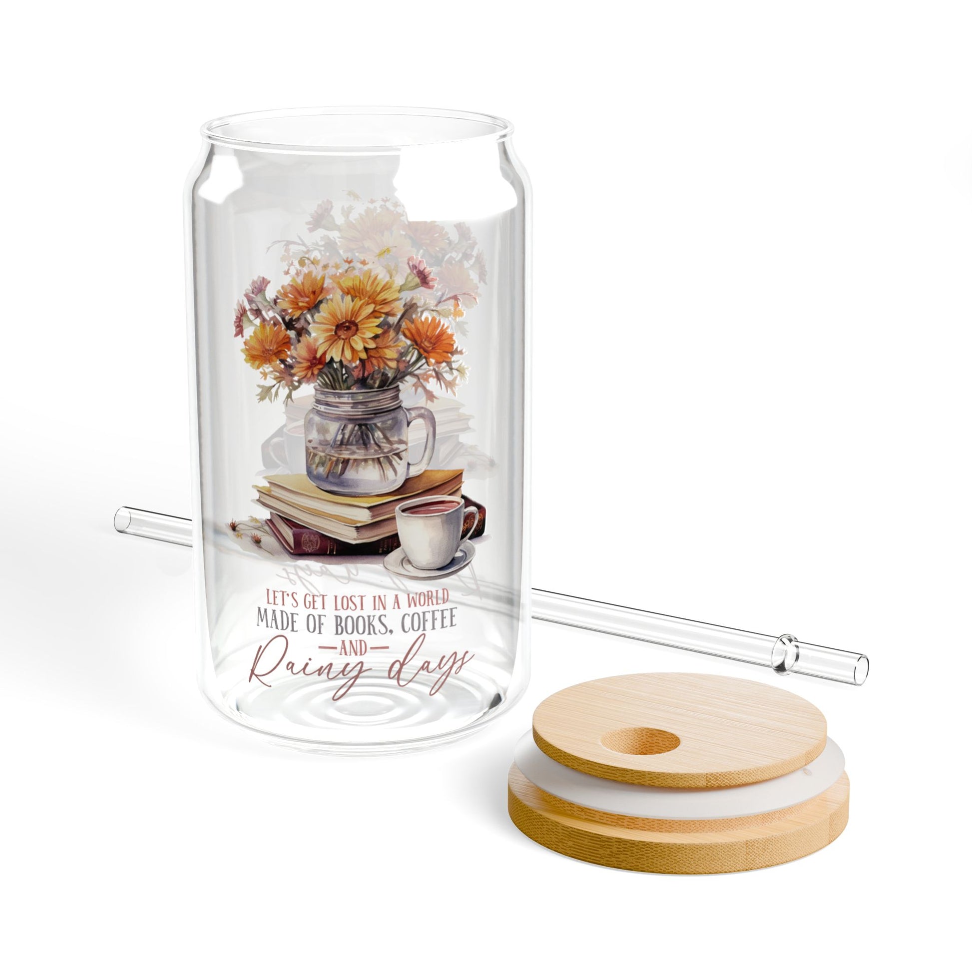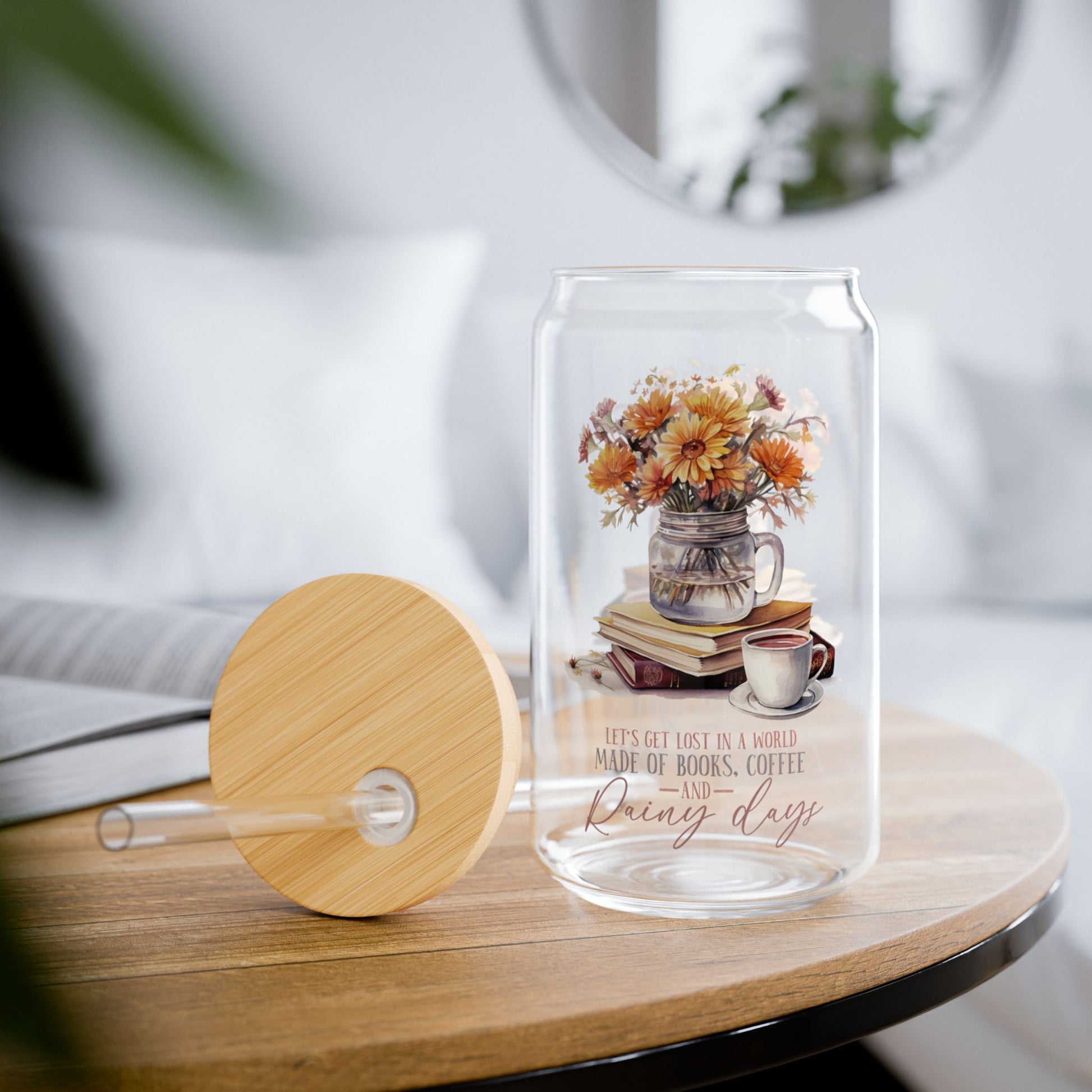 'Books Coffee and Rainy Days' | 16oz Custom Sipper Glass with Bamboo Lid & Straw – Perfect for Sweet Treats and Family Parties