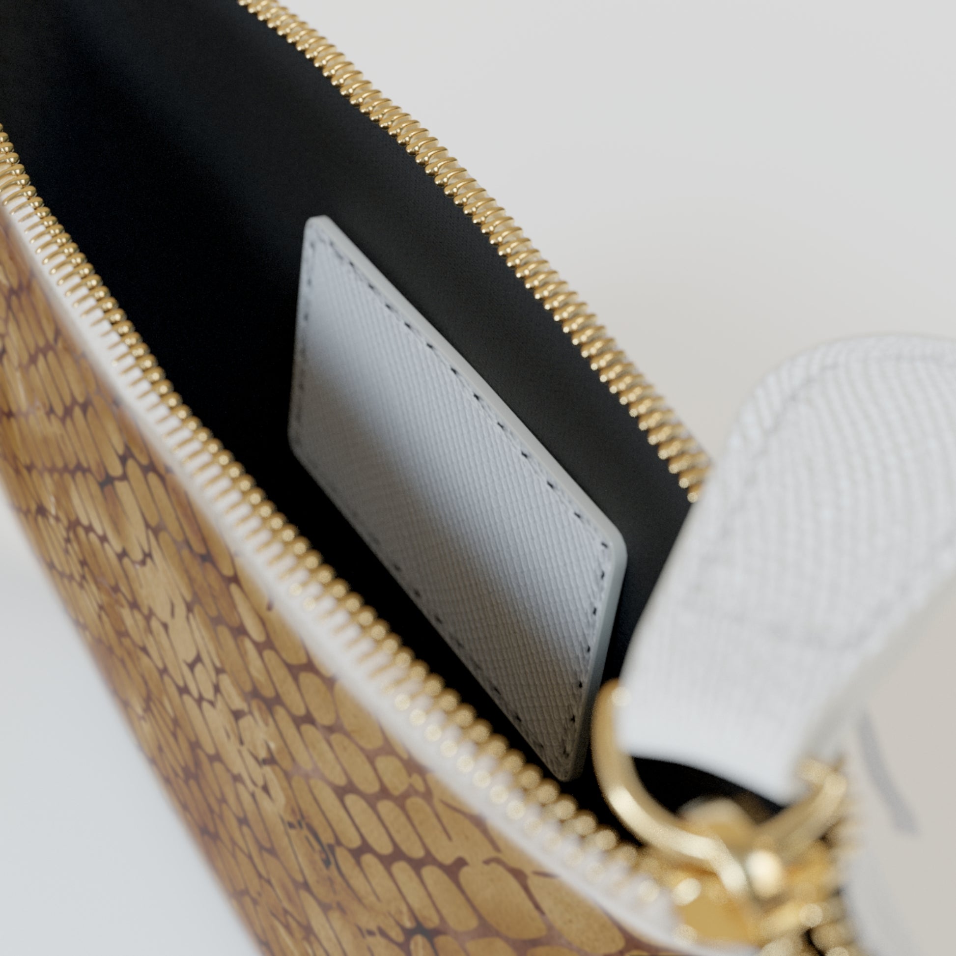 Crafted from premium, cruelty-free faux leather with a refined Saffiano texture, it delivers the sumptuous feel of genuine leather while honoring eco-conscious values. A gleaming gold-toned zipper adds radiant detail and secure closure, ensuring seamless transitions from daytime polish to evening glamour. Whether carried to a brunch, gallery opening, cocktail soirée, or gifted as a treasured keepsake, Amber Venom brings an element of refined boldness to any occasion.