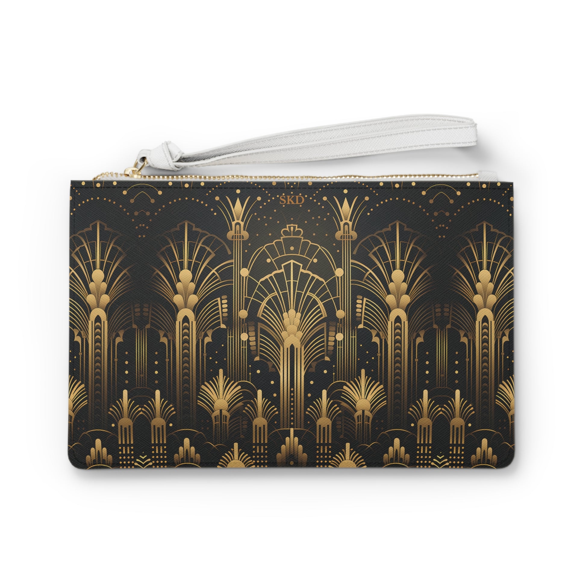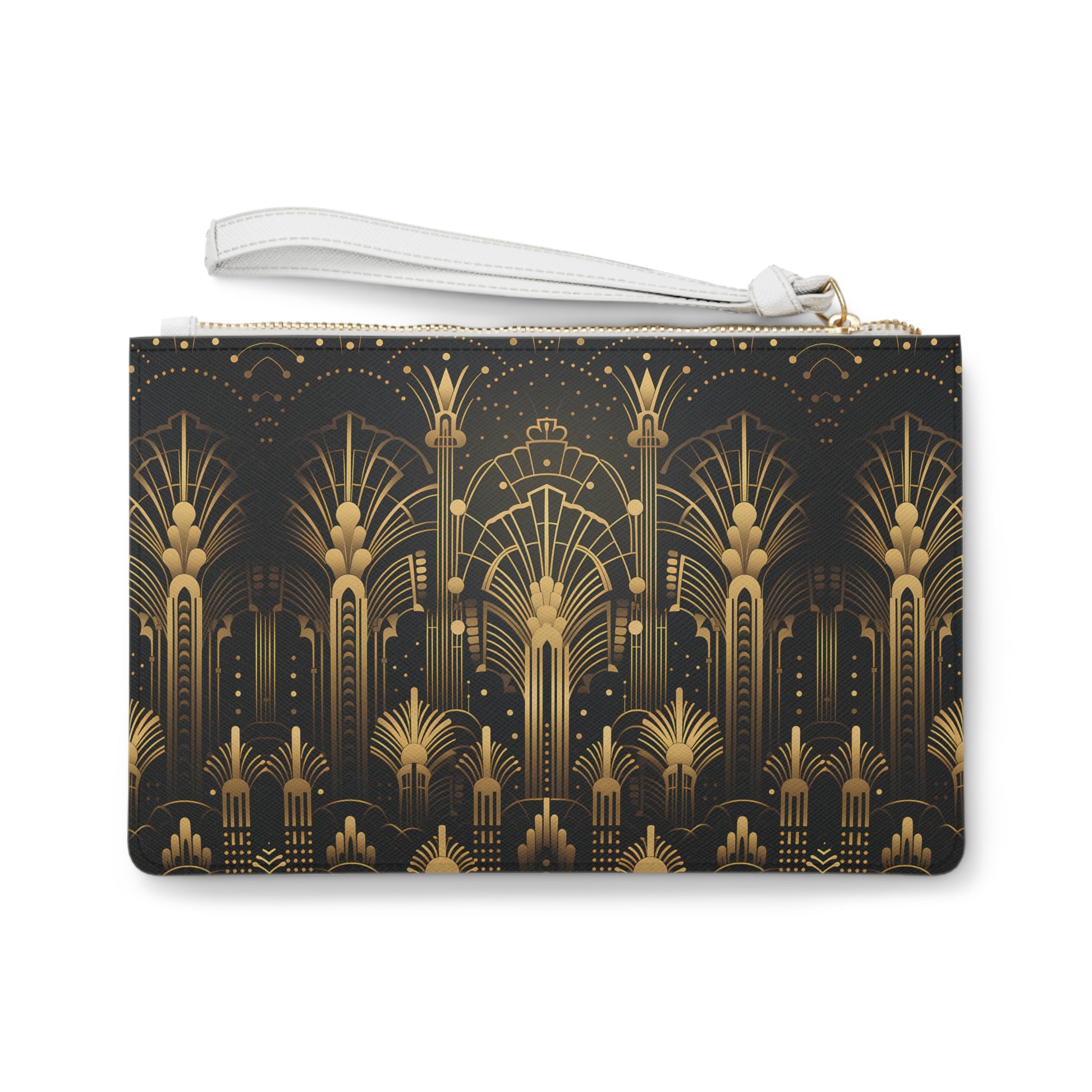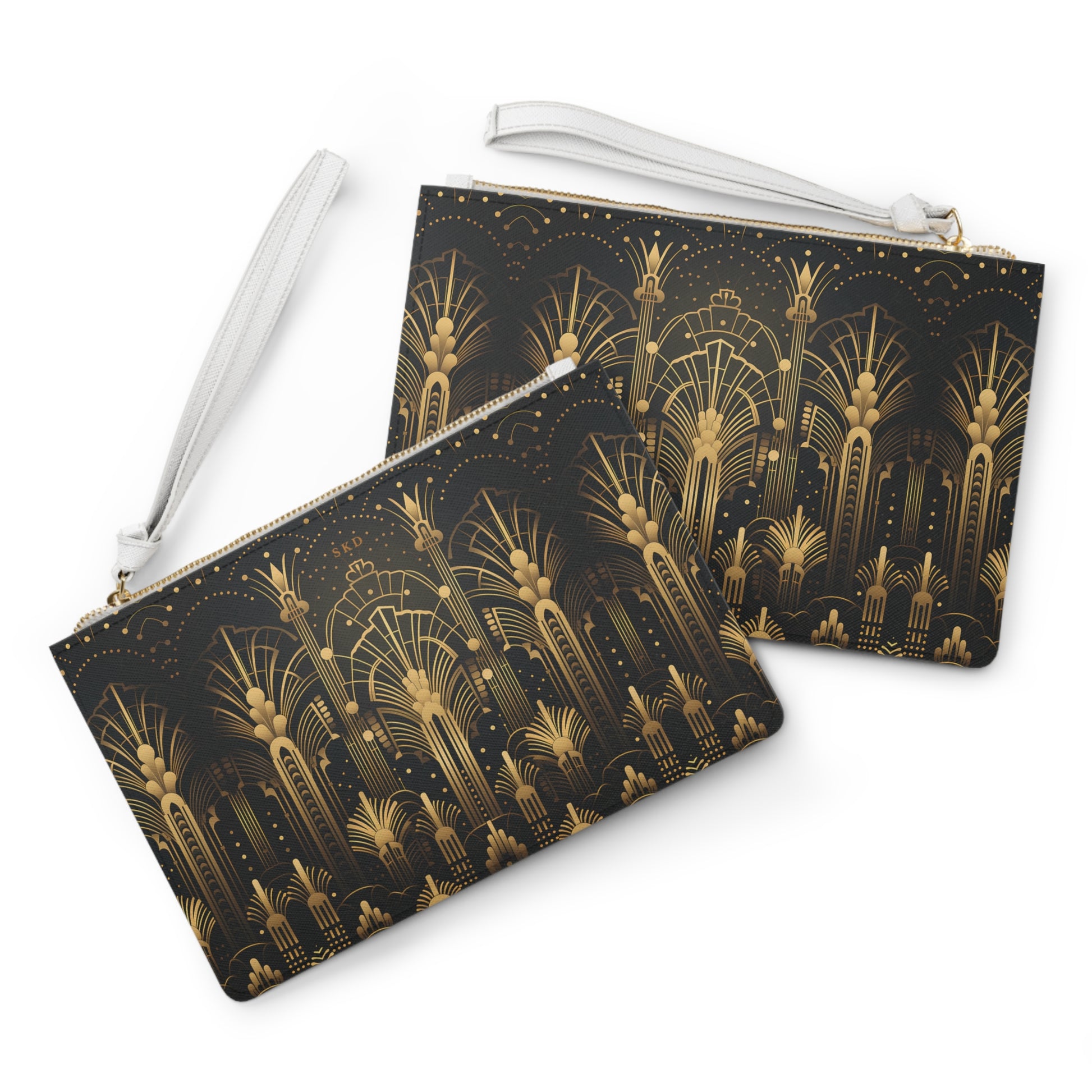 Step into timeless glamour with the Limited Edition Gatsby Opulence — the black and gold Art Deco clutch adorned with glittering geometric motifs that capture the extravagance and elegance of the Jazz Age. Crafted from premium faux leather with a sleek, polished finish, this statement accessory transitions effortlessly from a sophisticated daytime affair to an evening of dazzling sophistication. Its lightweight structure and crisp white wrist strap offer both comfort and modern contrast, while the streamlined silhouette keeps your essentials secure and organized. Perfect for cocktail parties, roaring ’20s events, or high-profile celebrations, this clutch blends vintage-inspired opulence with contemporary versatility, making it a must-have piece for those who embrace luxury with a bold edge.