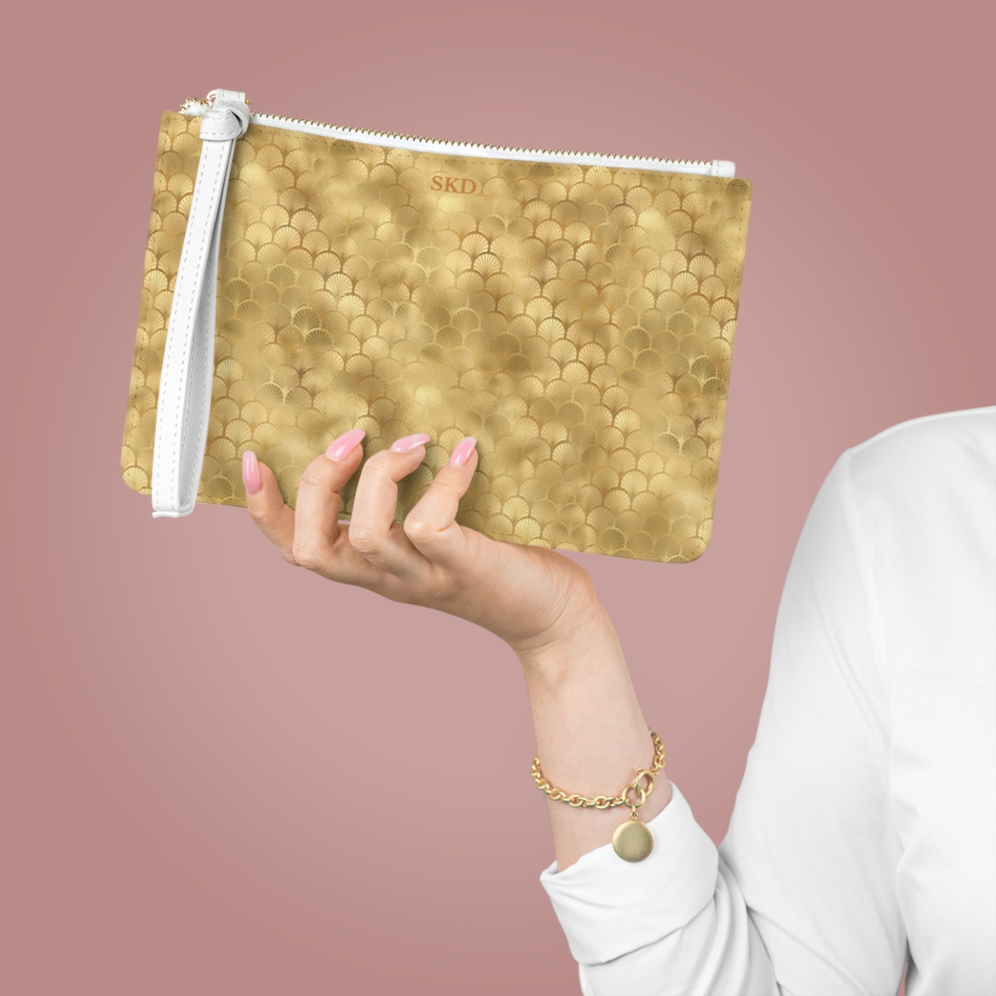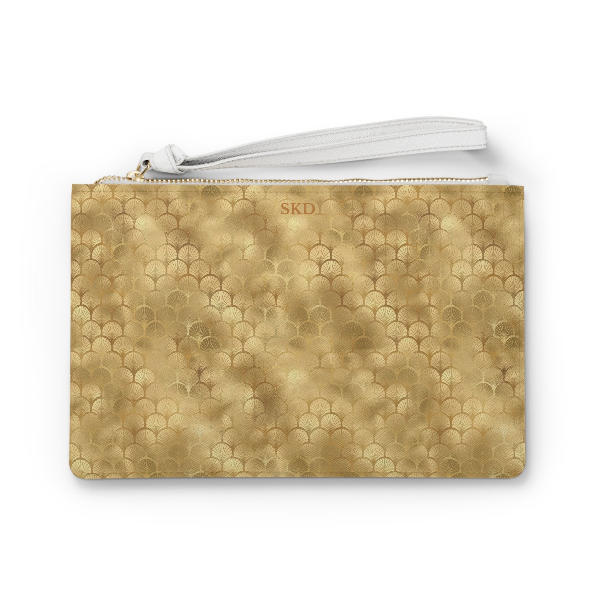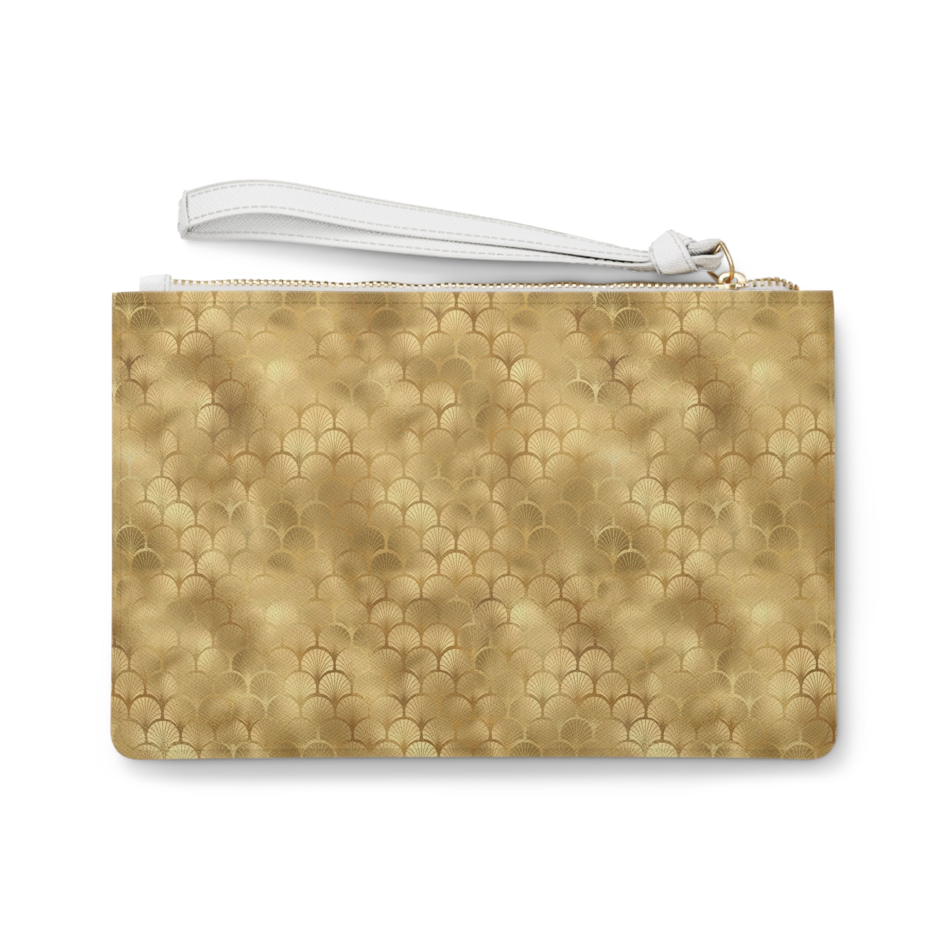 Radiate luminous elegance with Gold Horizon — the metallic gold clutch featuring a shimmering scalloped pattern that exudes sunlit glamour and opulent sophistication. Crafted from premium faux leather with a smooth, refined finish, this versatile accessory transitions effortlessly from a daytime celebration to an evening of elevated style. Its lightweight yet durable construction and crisp white wrist strap offer both comfort and chic contrast, while the sleek silhouette keeps your essentials secure and organized. Perfect for weddings, holiday soirées, or red-carpet occasions, this clutch blends golden radiance with modern refinement, making it a coveted statement piece for those who treasure luxury in every detail.