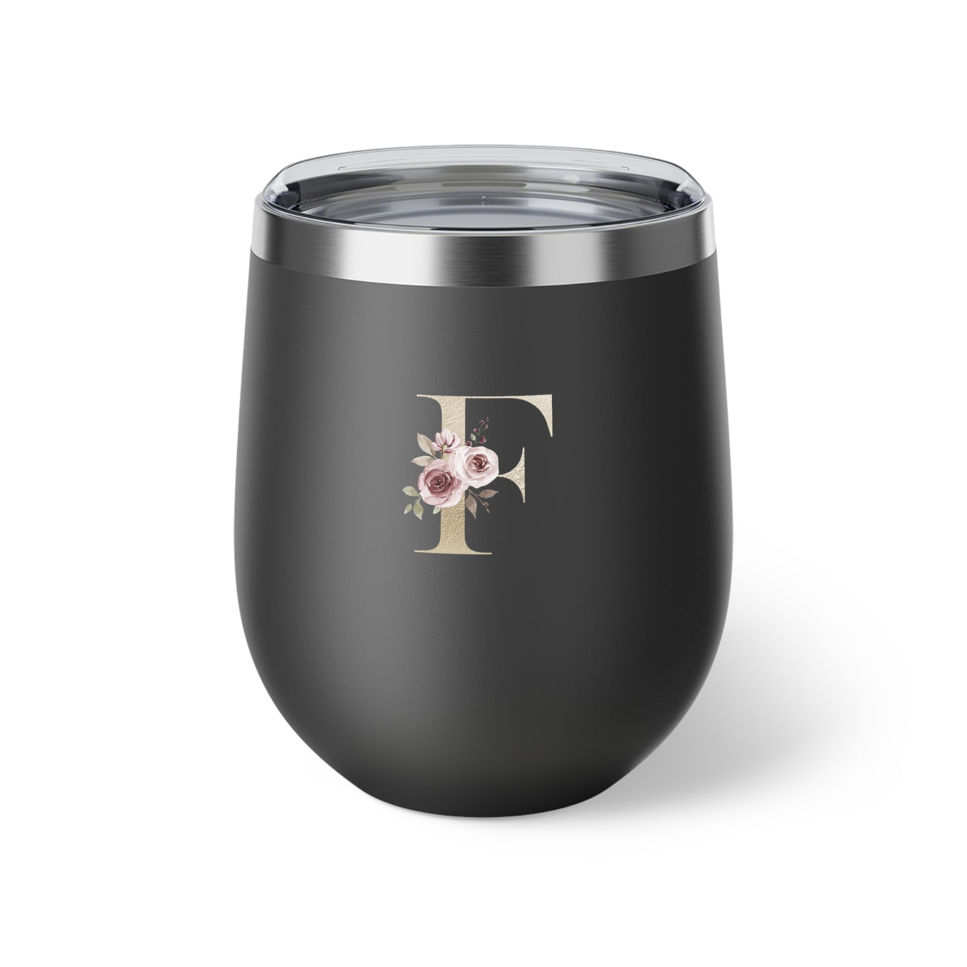 Letter F - Personalized Elegant Pink Rose Copper Vacuum Insulated Cup, 12 oz – Perfect for Weddings