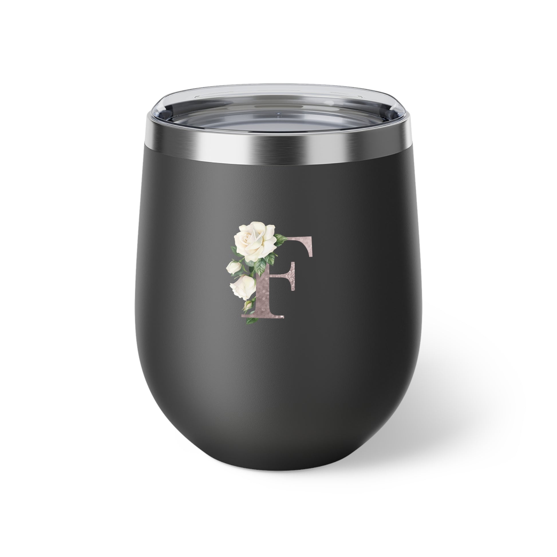 Letter F - Personalized Romantic White Rose Copper Vacuum Insulated Cup, 12 oz – Perfect for Weddings