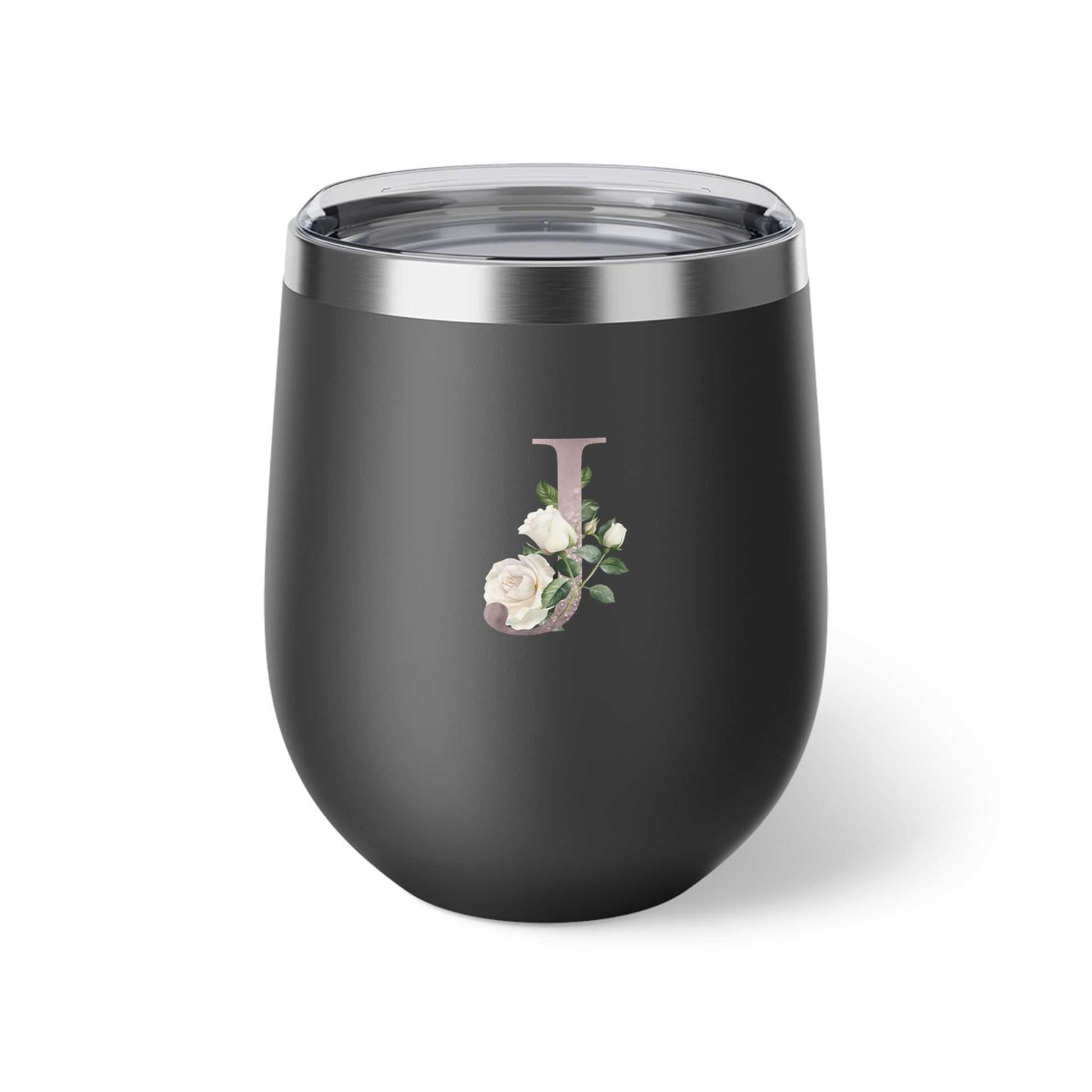 Letter J - Personalized Romantic White Rose Copper Vacuum Insulated Cup, 12 oz – Perfect for Weddings