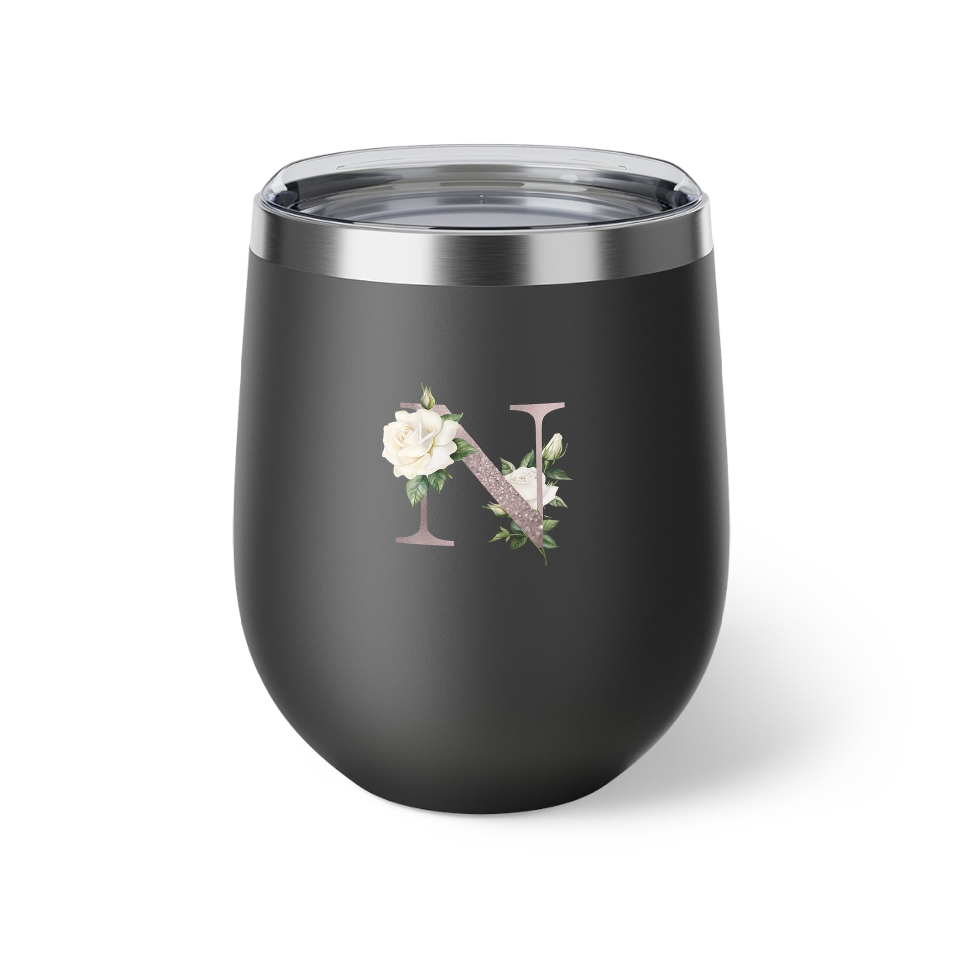 Letter N - Personalized Romantic White Rose Copper Vacuum Insulated Cup, 12 oz – Perfect for Weddings