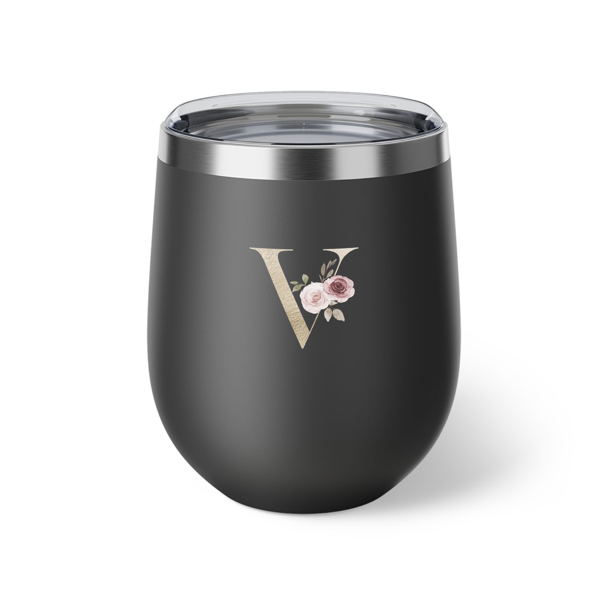 Letter V - Personalized Elegant Pink Rose Copper Vacuum Insulated Cup, 12 oz – Perfect for Weddings