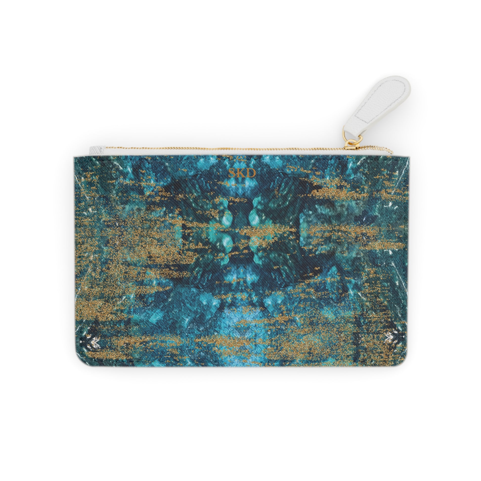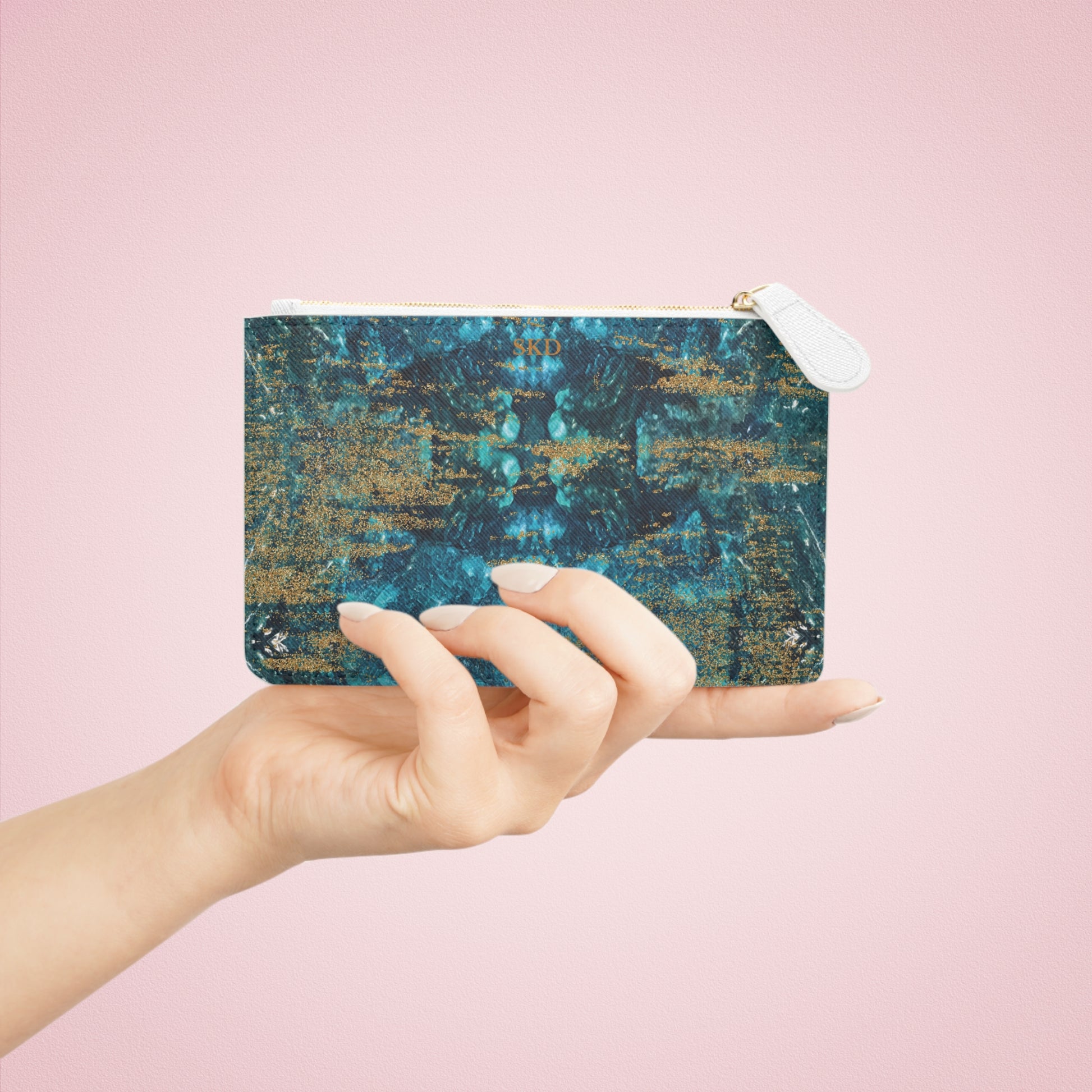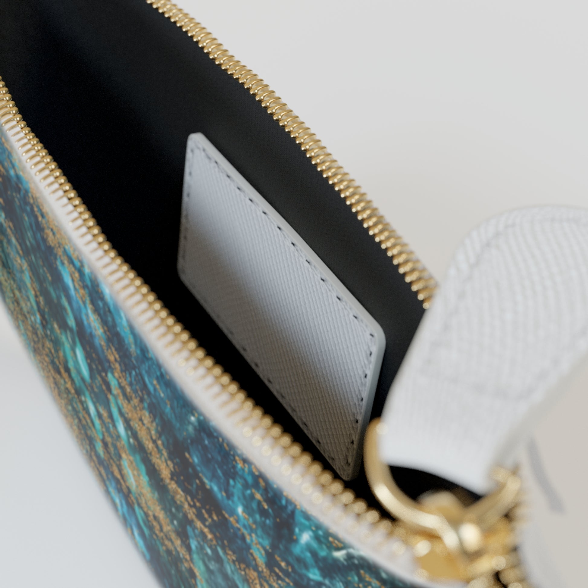 Crafted from premium cruelty-free PU leather with a refined Saffiano texture, it offers both artistry and durability. Its gemstone-inspired teal-and-gold pattern radiates serenity and transformation, while gold-toned hardware and a secure zipper closure add a touch of regal brilliance. Compact yet functional, the interior includes a handy pocket for cards, keys, or small essentials, making it as practical as it is luxurious.