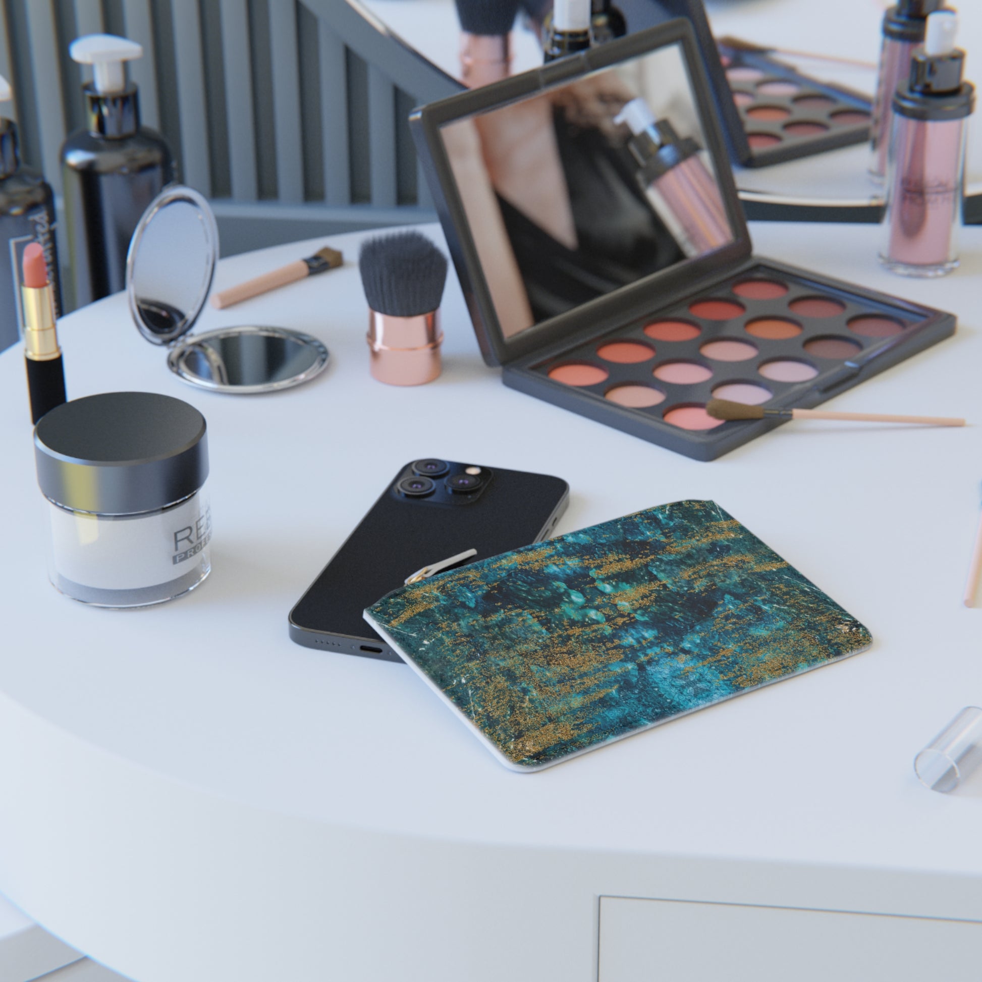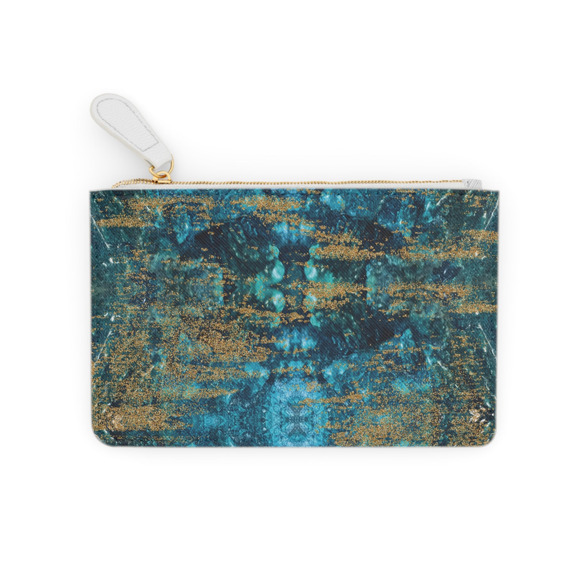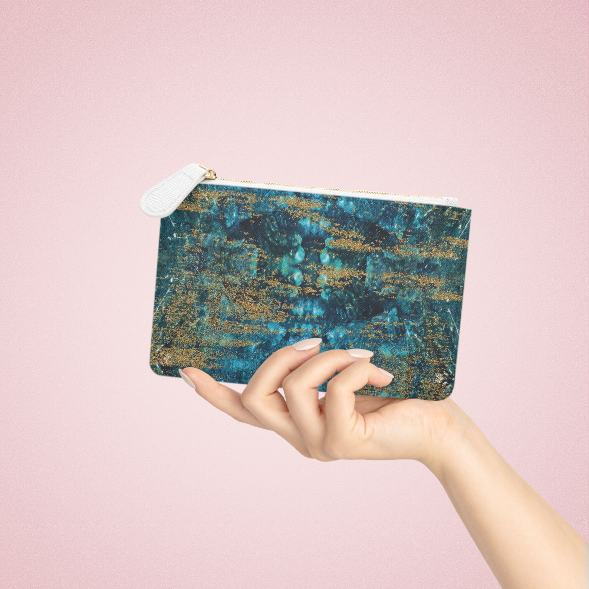 Crafted from premium cruelty-free PU leather with a refined Saffiano texture, it offers both artistry and durability. Its gemstone-inspired teal-and-gold pattern radiates serenity and transformation, while gold-toned hardware and a secure zipper closure add a touch of regal brilliance. Compact yet functional, the interior includes a handy pocket for cards, keys, or small essentials, making it as practical as it is luxurious.