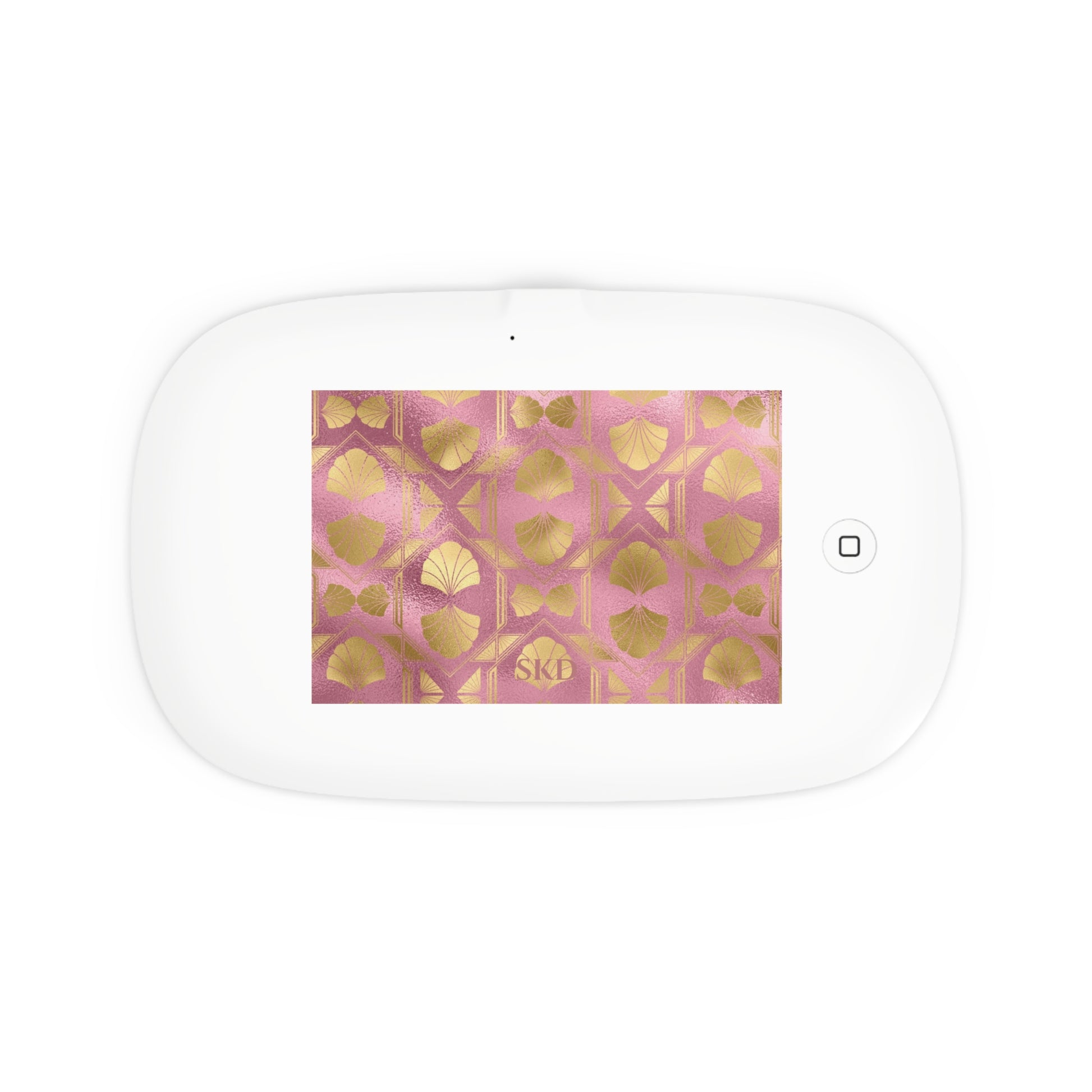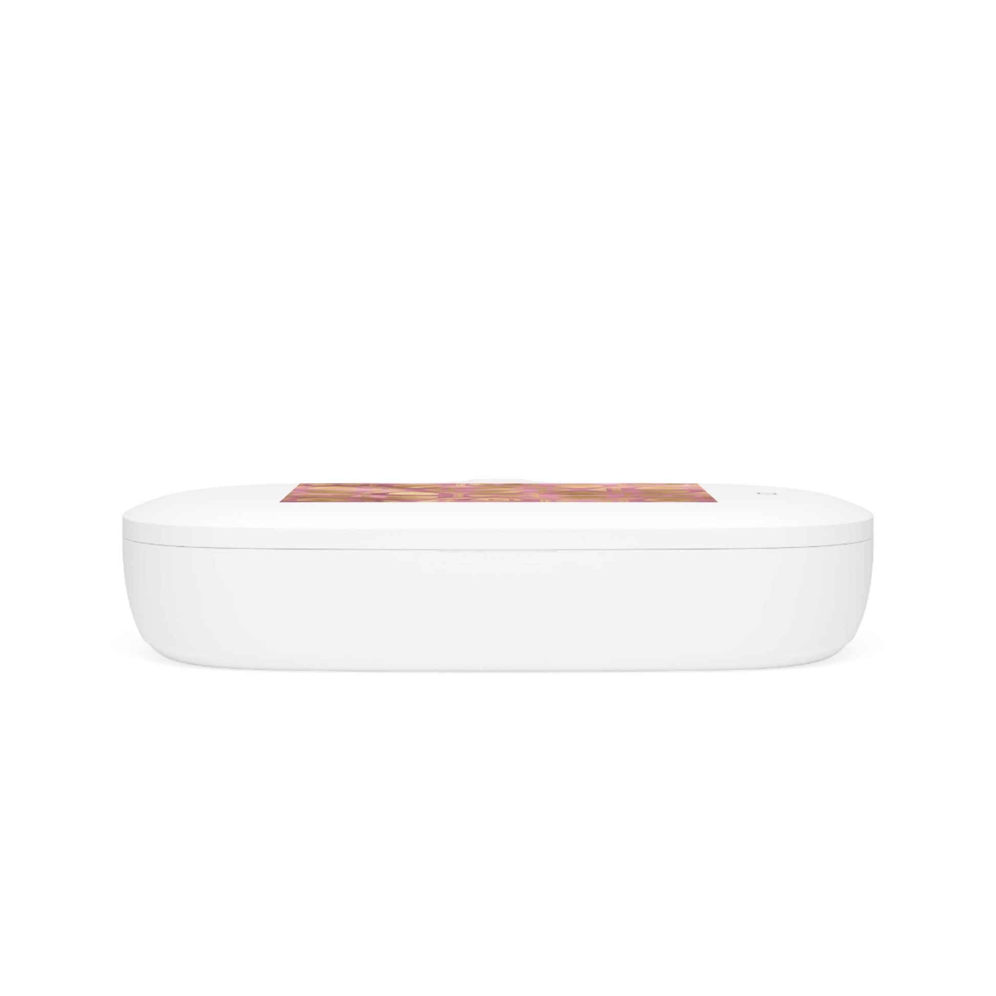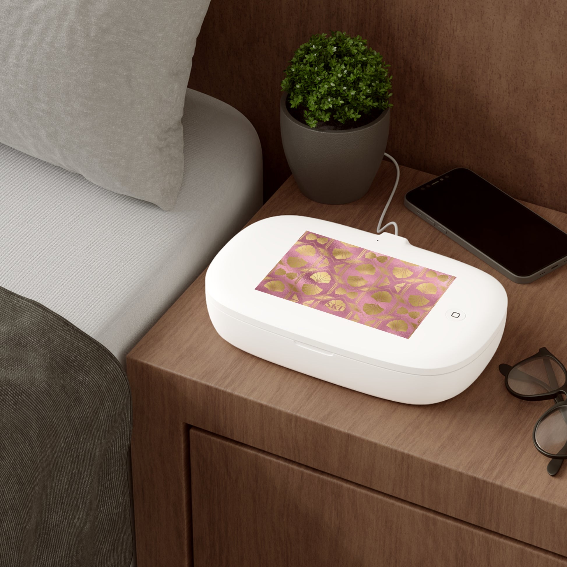 Perfect for large smartphones, keys, jewelry, earbuds, and other small essentials, it doubles as a 5W wireless charging pad, keeping your phone powered while it’s sanitized. The soft, pastel pink and gold pattern catches light beautifully, making it a standout on your nightstand, desk, or entryway table.