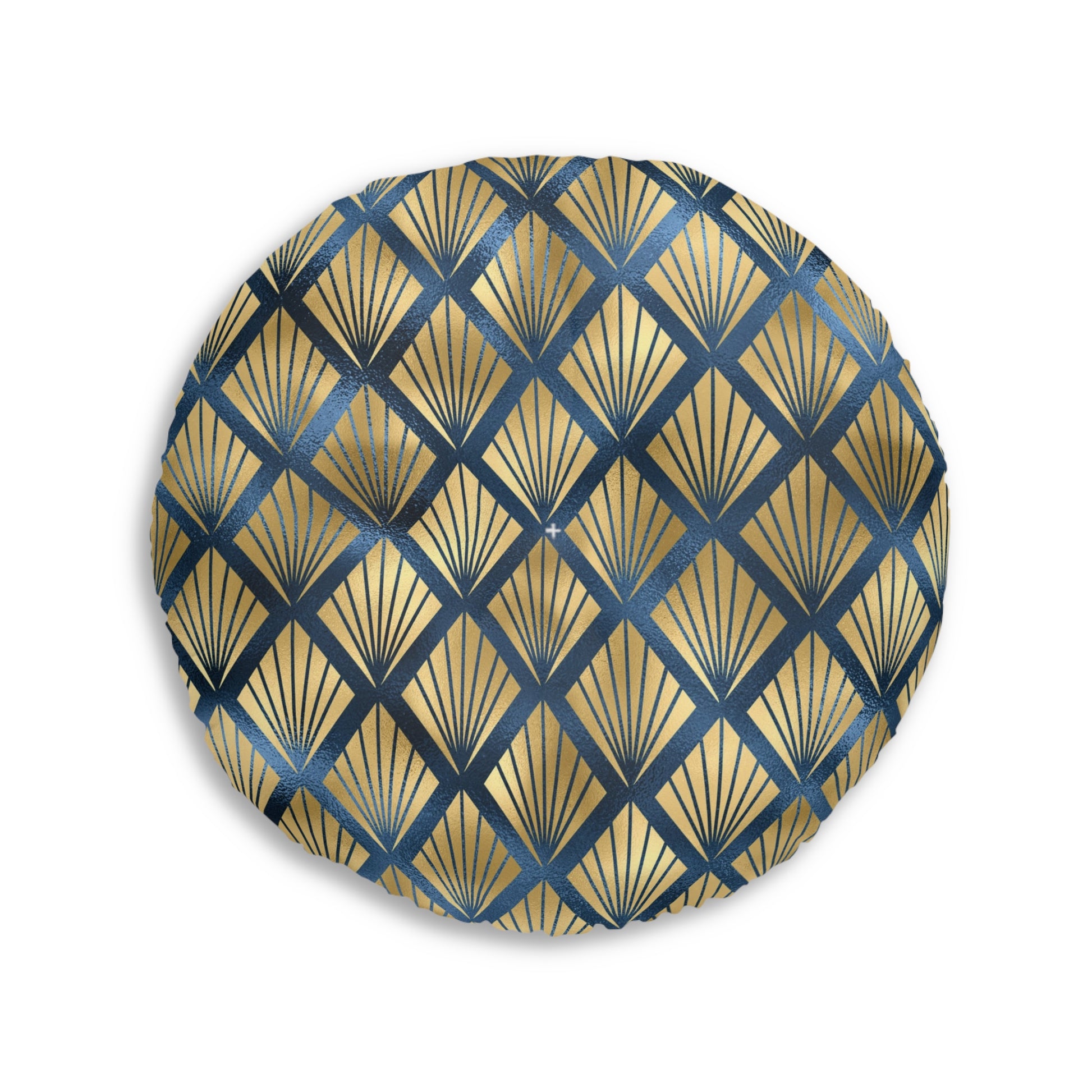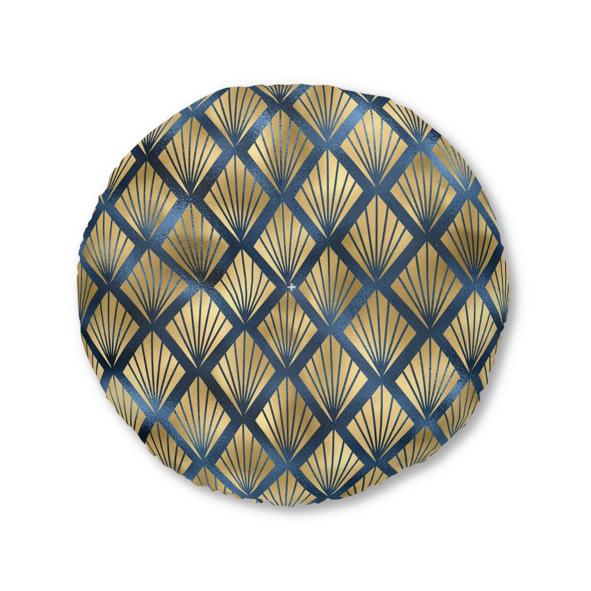 Step into an era of timeless glamour with the Art Deco Elegance, a striking 26″ or 30″ tufted round pillow that fuses geometric artistry with luxurious design. The bold fan-shaped motif in gilded gold against a rich midnight blue backdrop brings a sense of refined opulence to any setting.