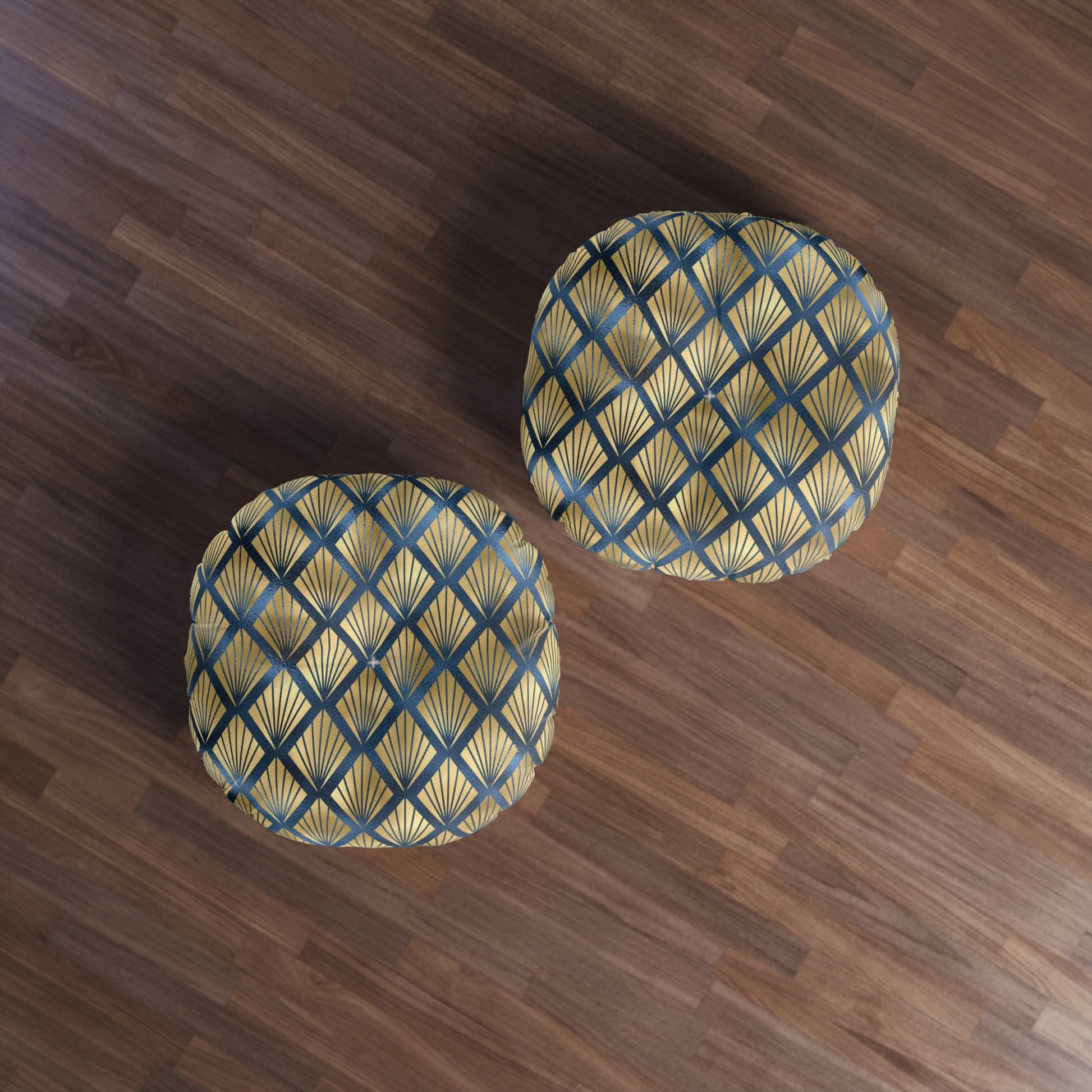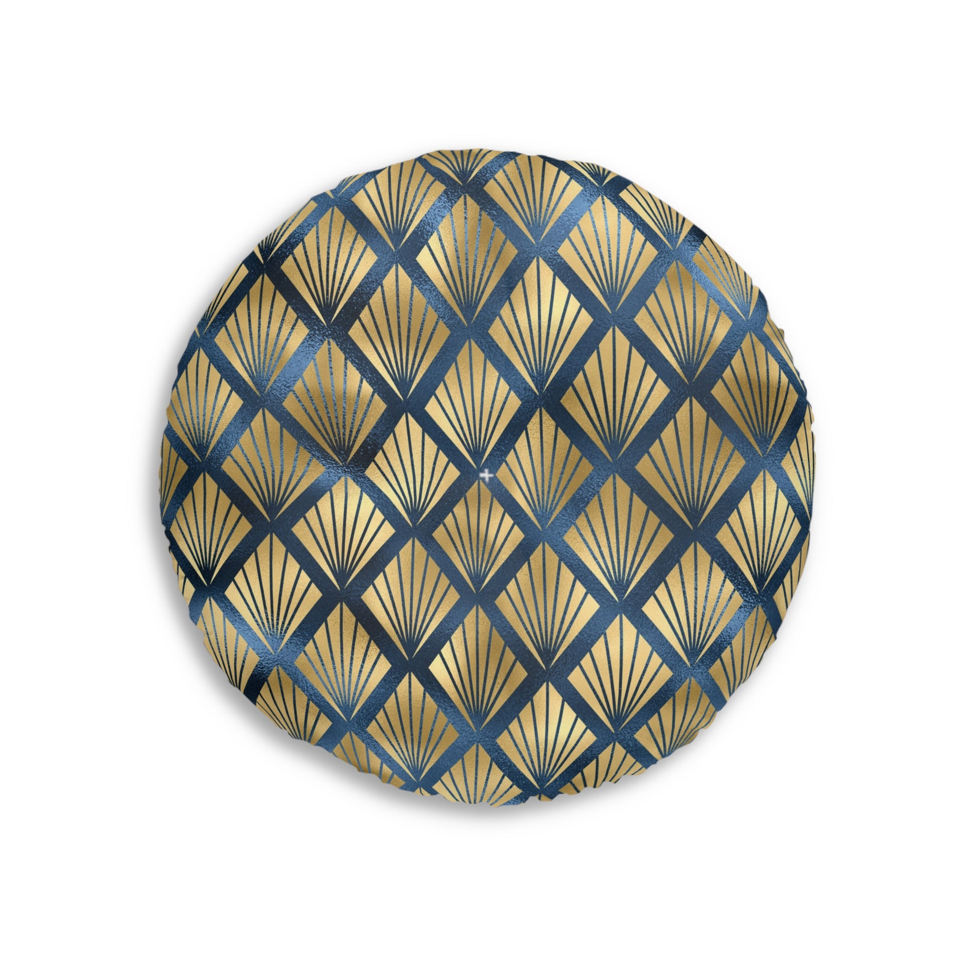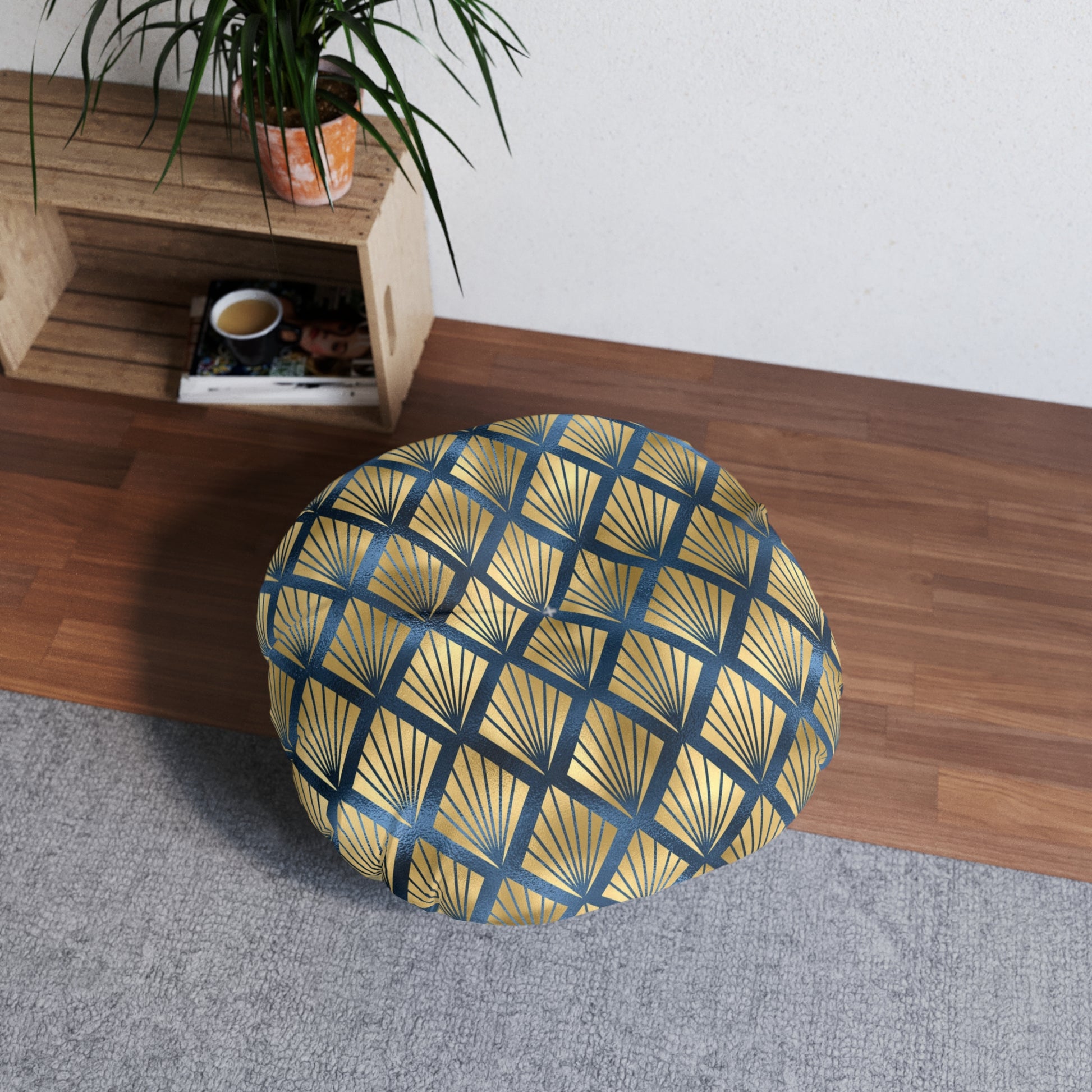 Art Deco Elegance | Gold & Blue Tufted Round Pillow | Timeless Glamour with Geometric Luxe Design