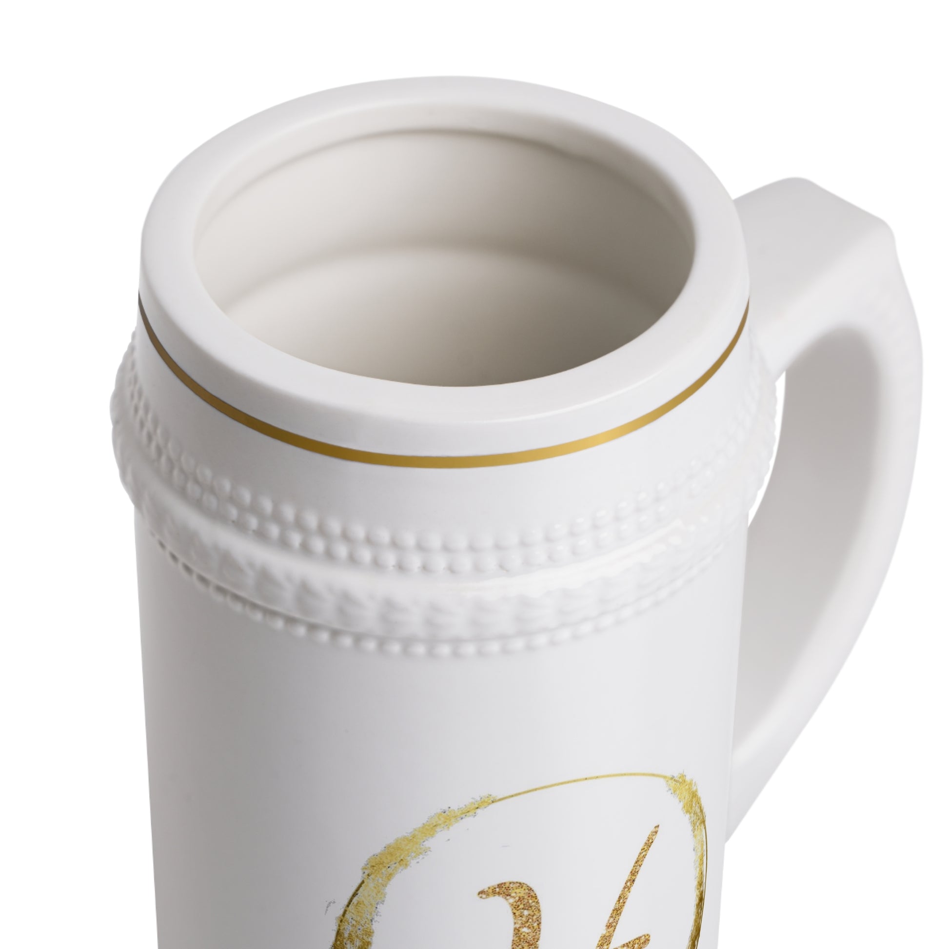 Elevate your gift-giving with our personalized white stein mug, featuring the recipient's first initial for a timeless and elegant touch. Perfect for birthdays, holidays, and special celebrations, this custom ceramic stein offers a unique and thoughtful gift option for beer lovers or anyone who enjoys personalized drinkware. The classic design, paired with gold-colored details on the rim and base, makes it a standout piece for any occasion.