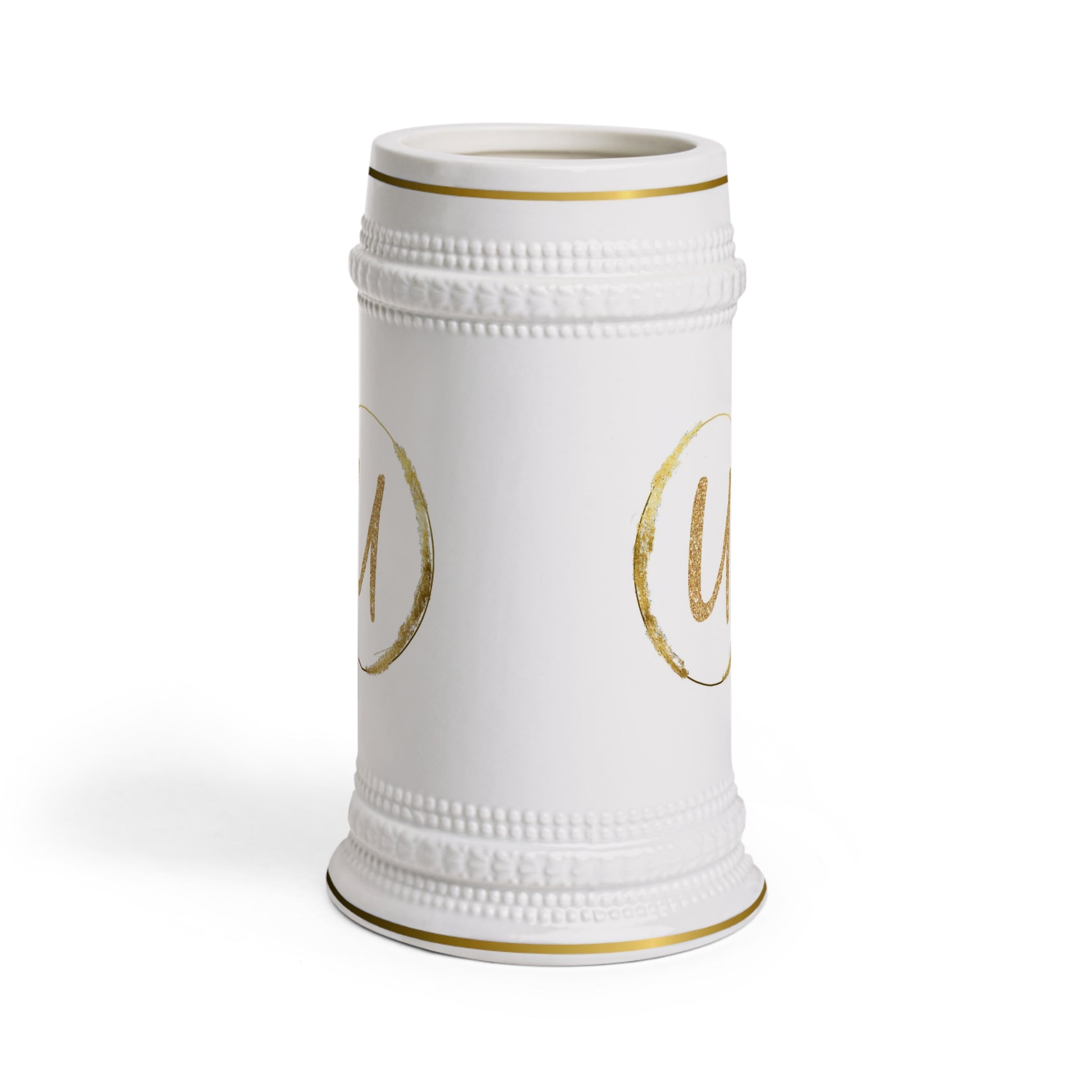 Elevate your gift-giving with our personalized white stein mug, featuring the recipient's first initial for a timeless and elegant touch. Perfect for birthdays, holidays, and special celebrations, this custom ceramic stein offers a unique and thoughtful gift option for beer lovers or anyone who enjoys personalized drinkware. The classic design, paired with gold-colored details on the rim and base, makes it a standout piece for any occasion.