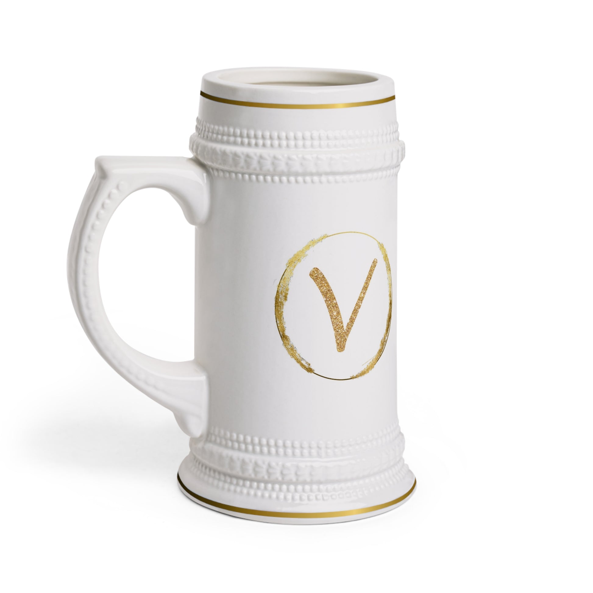 Letter V - Personalized Beer Stein Mug – Custom Initial Ceramic Stein with Gold Accents | Perfect Gift for Beer Lovers