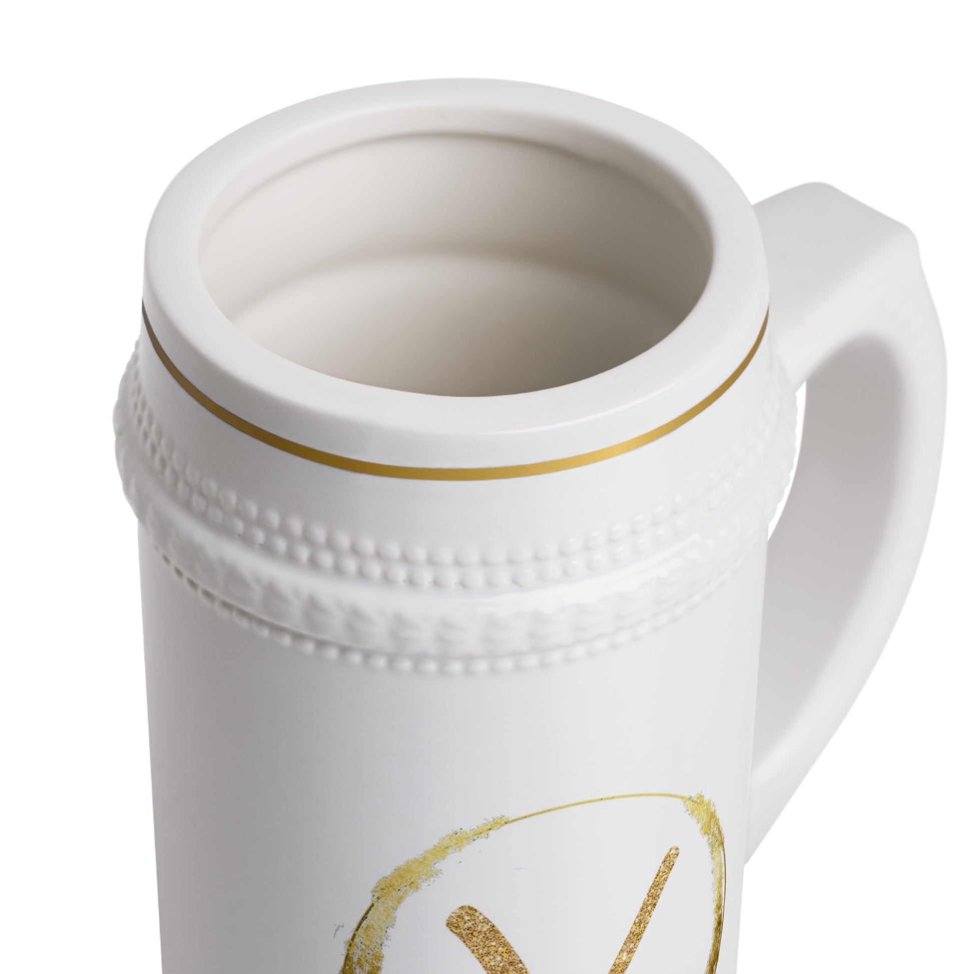 Elevate your gift-giving with our personalized white stein mug, featuring the recipient's first initial for a timeless and elegant touch. Perfect for birthdays, holidays, and special celebrations, this custom ceramic stein offers a unique and thoughtful gift option for beer lovers or anyone who enjoys personalized drinkware. The classic design, paired with gold-colored details on the rim and base, makes it a standout piece for any occasion.