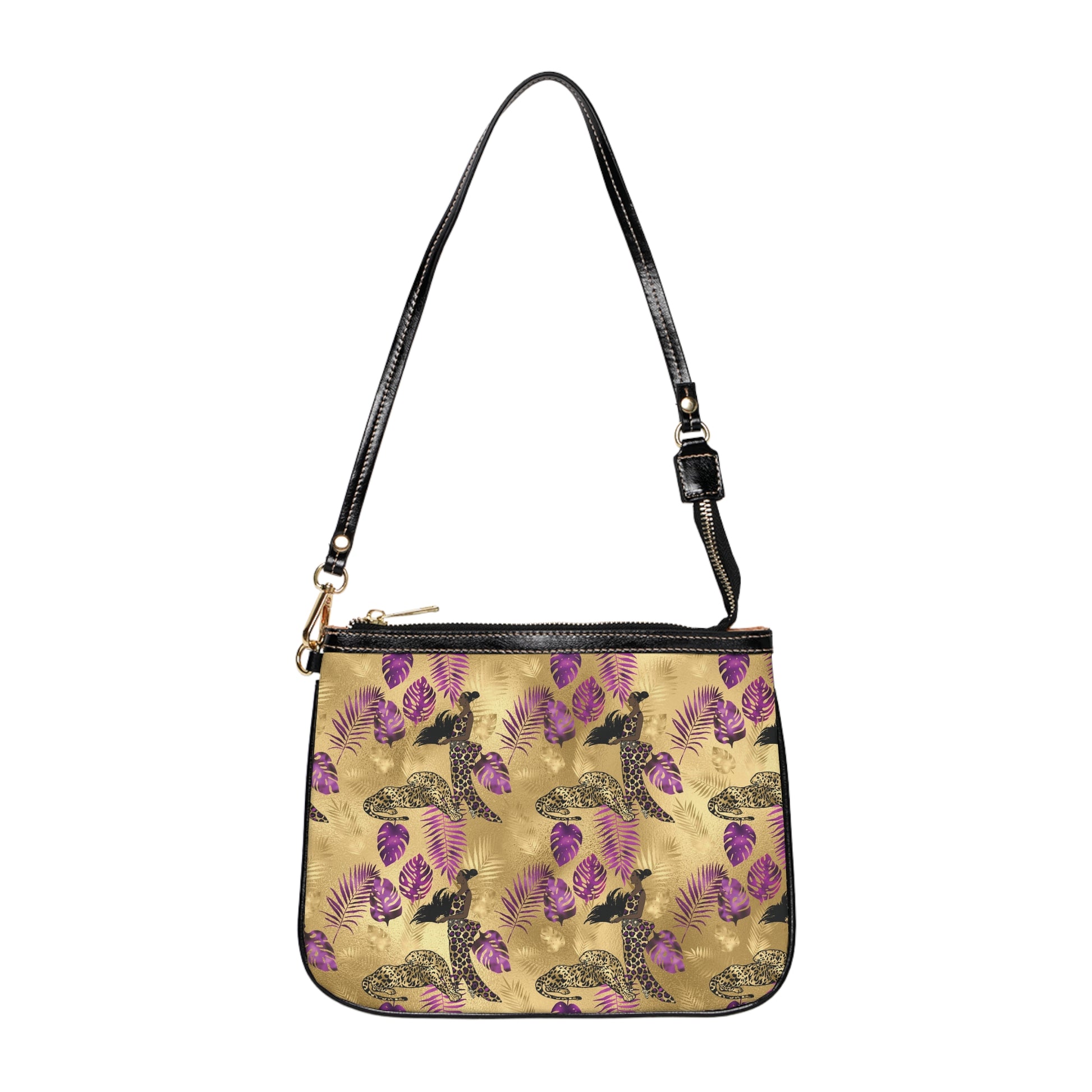 Step into a world of exotic artistry and untamed sophistication with the Wild Majesty Small Shoulder Bag, a refined design featuring golden leopards and striking purple tropical leaves set against a luxe golden backdrop. Created for the modern style connoisseur, this piece is more than a bag—it’s an expression of confidence, individuality, and fierce elegance.